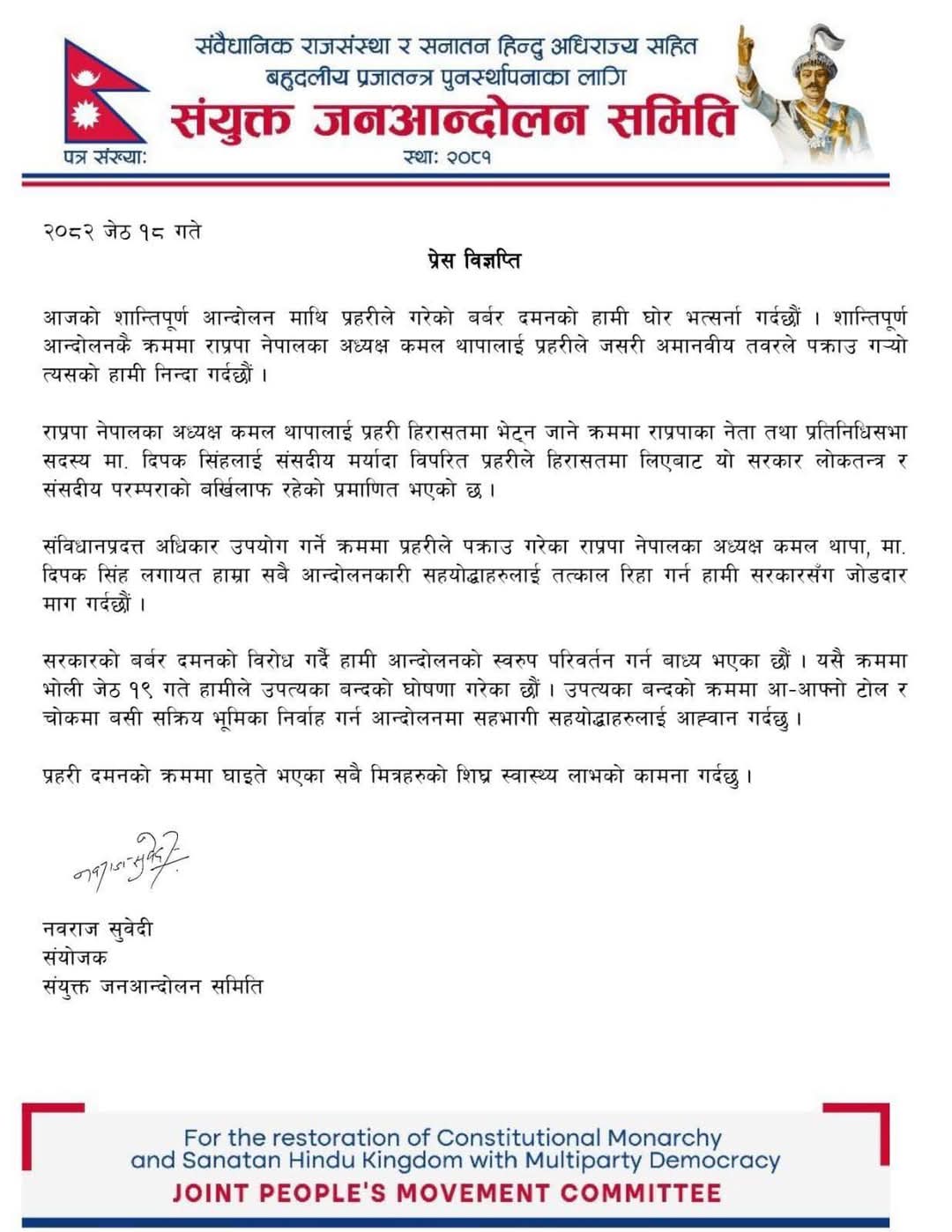 साथै समितिले आन्दोलनका क्रममा पक्राउ परेका राप्रपा नेपालका अध्यक्ष कमल थापालगायतलाई तत्काल रिहा गर्न सरकारसँग माग गरेको छ।