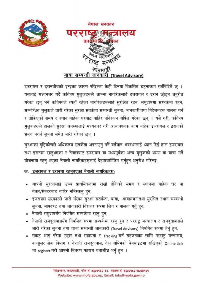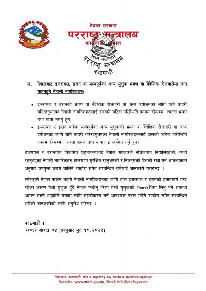 त्यस्तै, इजरायल र इरानबाहेक मध्यपूर्वका अन्य मुलुकको भ्रमण वा वैदेशिक रोजगारी वा अन्य प्रयोजनका लागि जाने तयारी गरिरहनुभएका नेपाली नागरिकलाई हालको जटिल परिस्थिति कायम रहेसम्म त्यस्ता भ्रमण तथा यात्रालाई स्थगित गर्नु हुनसमेत सूचनामा उल्लेख छ । इजरायल र इरानबीच विकसित घटनाक्रमलाई नेपाल सरकारले नजिकबाट नियालिरहेको उल्लेख गर्दै त्यहाँ रहनुभएका नेपाली नागरिक हालसम्म सुरक्षित रहनुभएको र निजहरुको हितको रक्षा गर्न आवश्यकताअनुसार उपयुक्त कदम चालिने जनाएको छ ।