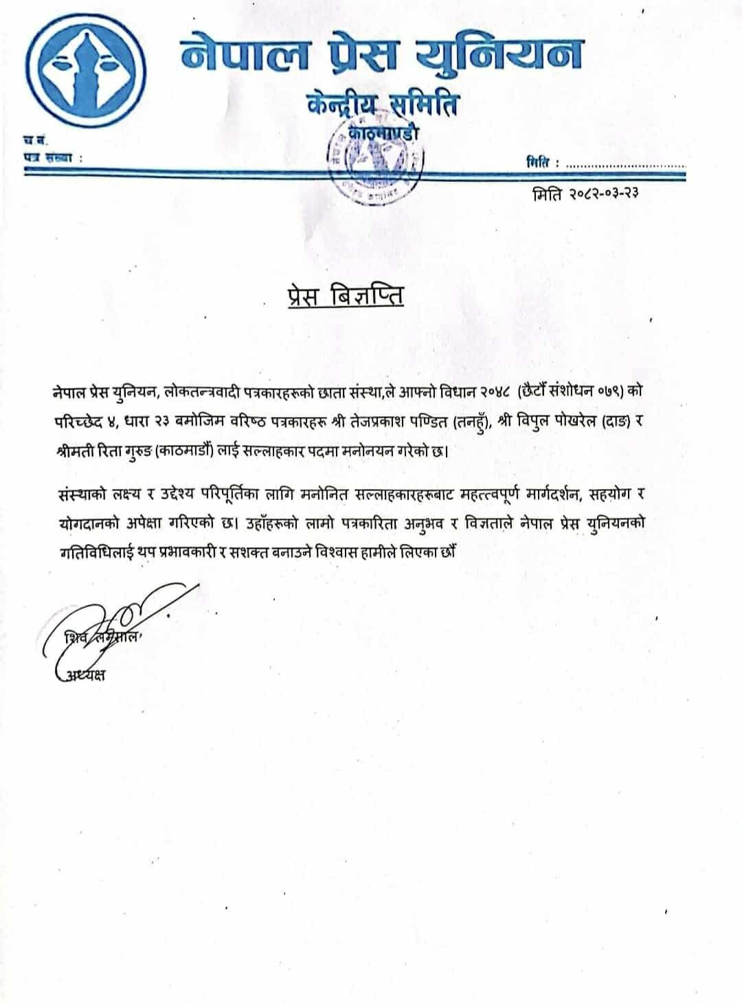 काठमाडौँ, २३ असार – लोकतन्त्रवादी पत्रकारहरुको छाता संस्था नेपाल प्रेस युनियनले आज तीन जना सल्लाहकार मनोनित गरेको छ । युनियनको विधान, २०४८ अनसार वरिष्ठ पत्रकारहरु तेजप्रकाश पण्डित (तनहुँ), विपुल पोखरेल (दाङ) र रिता गुरुङ (काठमाडौँ) लाई सल्लाहकार पदमा मनोनयन गरेको अध्यक्ष शिव लम्सालले जानकारी दिनुभयो ।