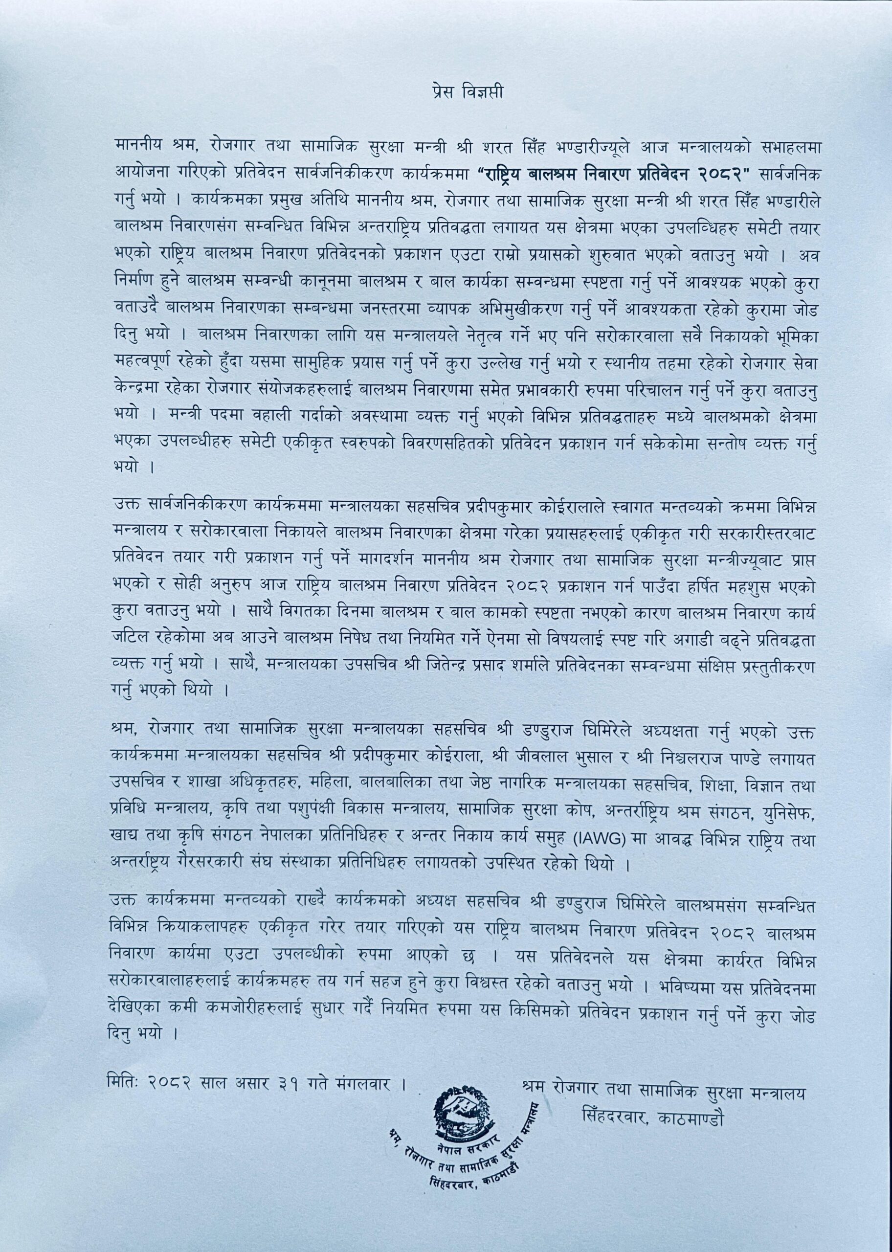 मन्त्रालयमा आज ‘राष्ट्रिय बालश्रम निवारण प्रतिवेदन २०८२’ सार्वजनिक गर्दै उहाँले यसका लागि सरोकारवालाको भूमिका महत्त्वपूर्ण रहेको बताउनुभयो ।