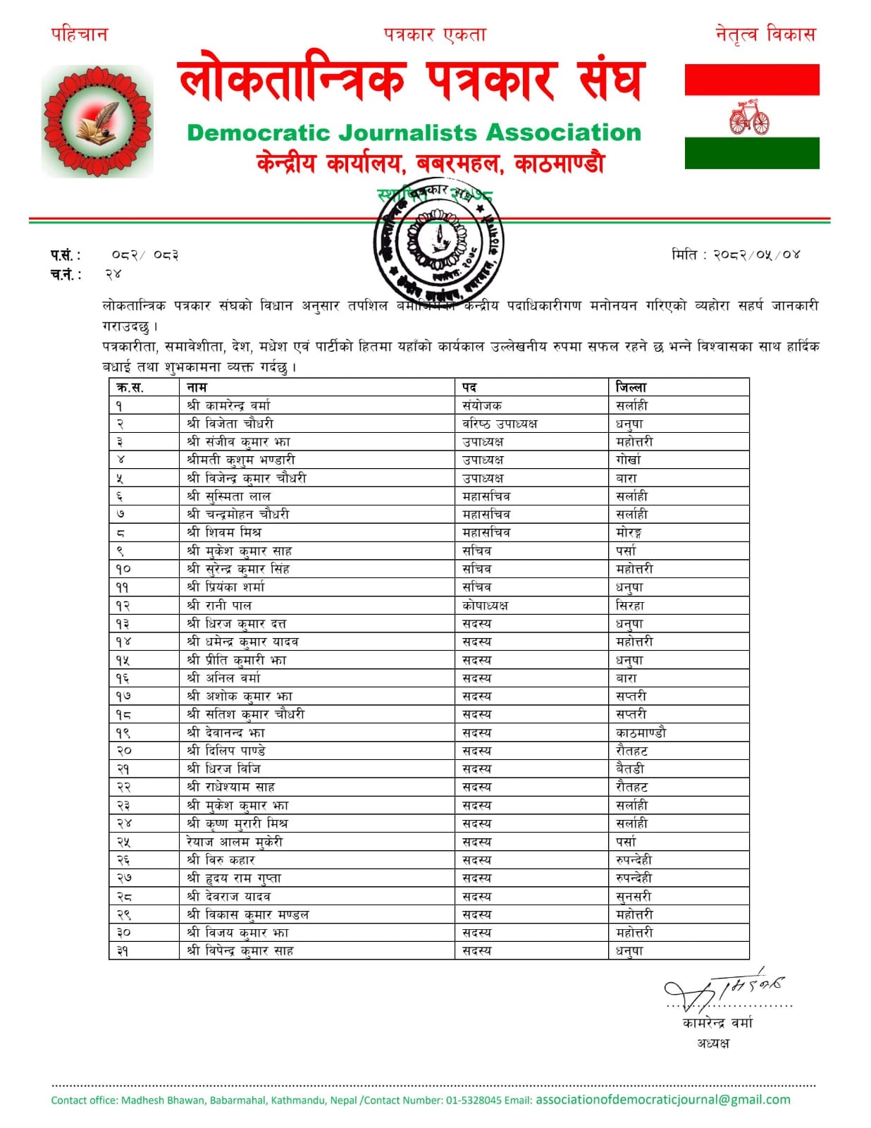 काठमाडौँ-लोकतान्त्रिक पत्रकार संघले आफ्नो विधानअनुसार नयाँ केन्द्रीय पदाधिकारी र सदस्यहरूको मनोनयन गरी कार्यसमिति विस्तार गरेको छ। संघले पत्रकार संघको संयोजक कामरेन्द्र वर्माको नेतृत्वमा कार्यसमिति विस्तार गरेका हुन् ।