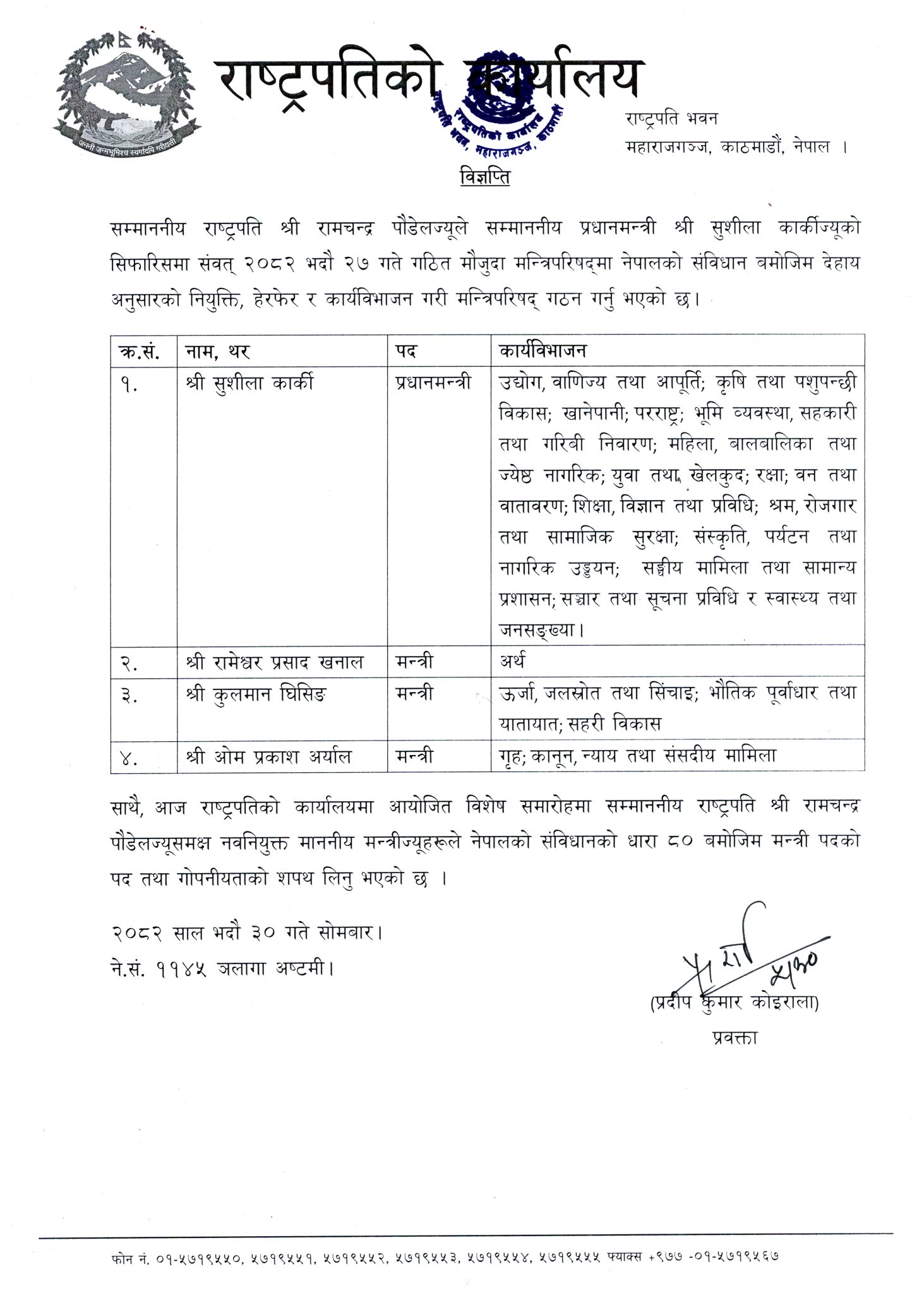 यी मन्त्रीहरूको शपथ सँगै कार्की मन्त्रिपरिषद्को औपचारिक विस्तारको सुरुवात भएको छ।