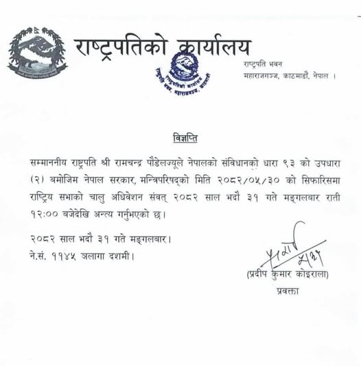नेपालको संविधानको धारा ९३ को उपधारा (२) बमोजिम मन्त्रिपरिषद्को सिफारिसमा राष्ट्रियसभाको चालु अधिवेशन भदौ ३१ गते राति १२:०० बजेदेखि अन्त्य गरिएको राष्ट्रपति कार्यालयले जानकारी दिएको छ।