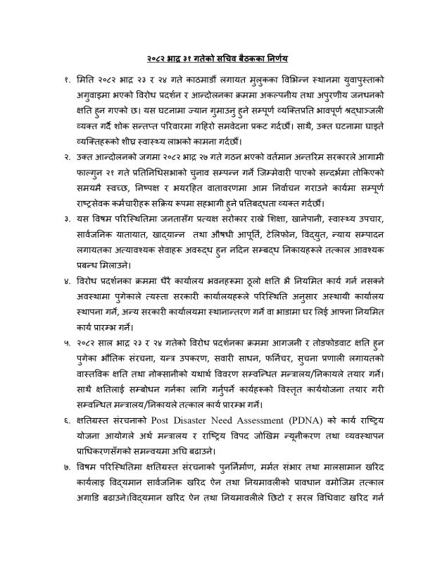 त्यस्तै आन्दोलनका क्रममा ध्वस्त भई नयाँ खरिद गर्नुपर्ने फर्निचरलगायतका सामानहरूको खरिदमा स्वदेशी उत्पादनलाई प्राथमिकता दिनुपर्ने निर्णय भएको स्रोतले बताएको छ। जेनजी युवा पुस्ताको चाहना बमोजिम सार्वजनिक सेवा प्रवाह एवं निर्णय प्रक्रिया चुस्त, मितव्ययी र प्रभावकारी बनाउन बाधक देखिएका मापदण्ड, कार्यविधि तथा निर्देशिकाहरू तत्काल खारेजी वा संशोधनको प्रक्रिया अगाडि बढाउन मुख्य सचिव अर्यालले निर्देशन दिएका छन्।