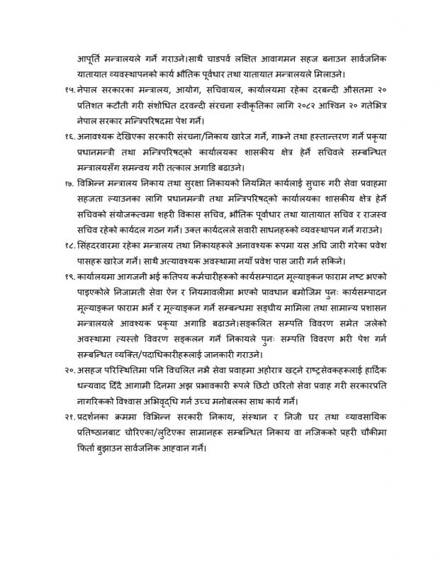 त्यस्तै अनावश्यक देखिएका सरकारी संरचना र निकाय खारेज गर्ने, गाभ्ने तथा हस्तान्तरण गर्ने प्रक्रिया प्रधानमन्त्री तथा मन्त्रिपरिषद्को कार्यालयका शासकीय क्षेत्र हेर्ने सचिवले सम्बन्धित मन्त्रालयसँग समन्वय गरी तत्काल अगाडि बढाउन निर्देशन दिइएको छ। त्यस्तै विभिन्न मन्त्रालय निकाय तथा सुरक्षा निकायको नियमित कार्यलाई सुचारु गरी सेवा प्रवाहमा सहजता ल्याउन कार्यदल गठन गर्ने र उक्त कार्यदलले सवारी साधनहरूको व्यवस्थापन गर्ने निर्णय भएको स्रोतले बताएको छ।