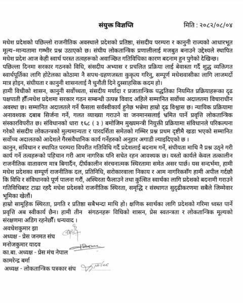संयुक्त विज्ञप्तिमा भनिएको छ, “मधेस प्रदेशको राजनीतिक अवस्थामा देखिएको बेथितिले स्थानीय शासन र जनप्रतिनिधिमाथि जनताको विश्वास कमजोर भएको छ। संविधान र कानुनको टेकेर अघि बढ्नुपर्ने प्रक्रियामा सत्ताको दुरुपयोग भएको देखिन्छ।”