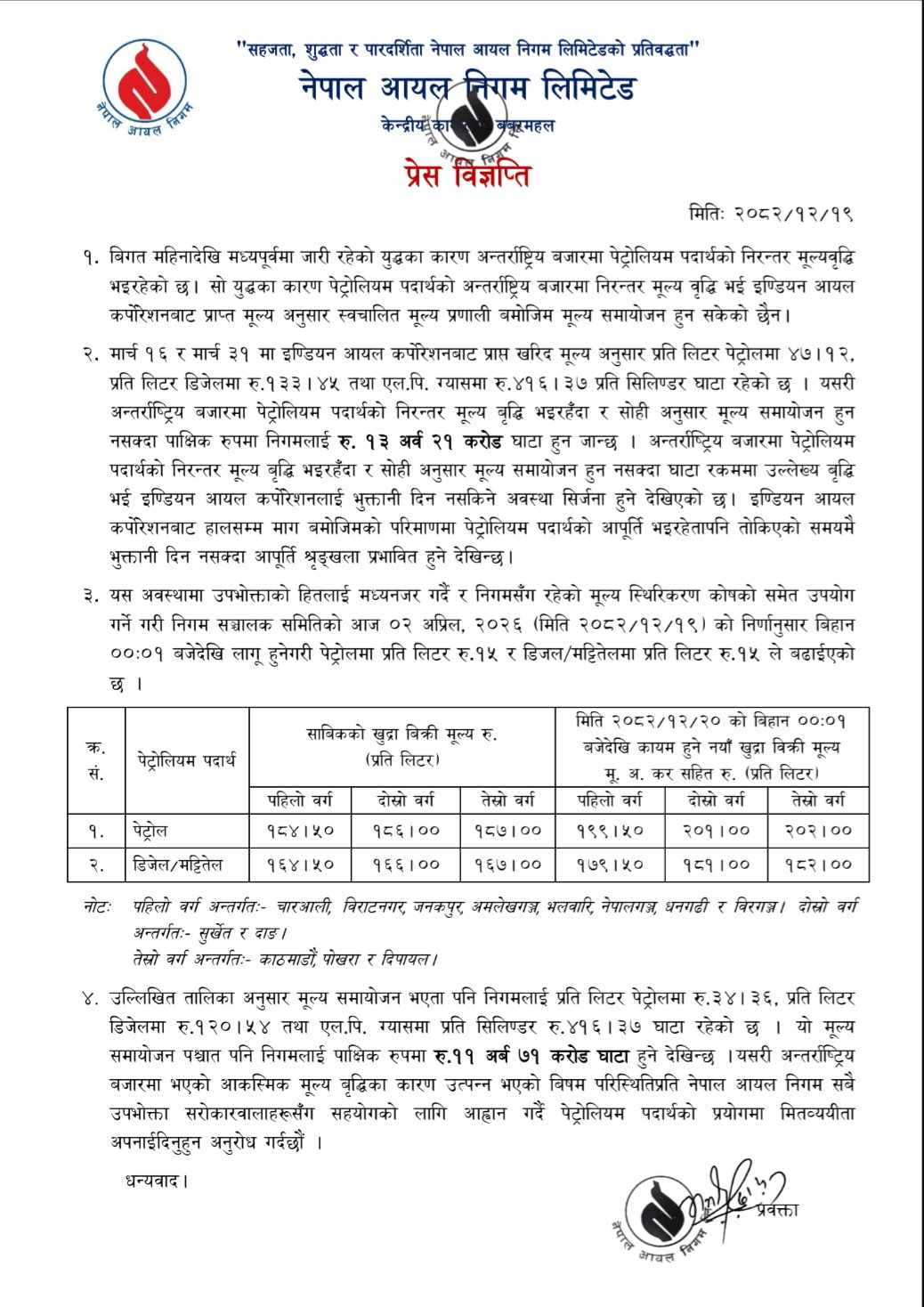 चैत २० गते (अहिले मध्यरात) बिहानैदेखि लागु हुने गरी आयल निगमले मूल्यवृद्धि गरेको जनाएको छ ।