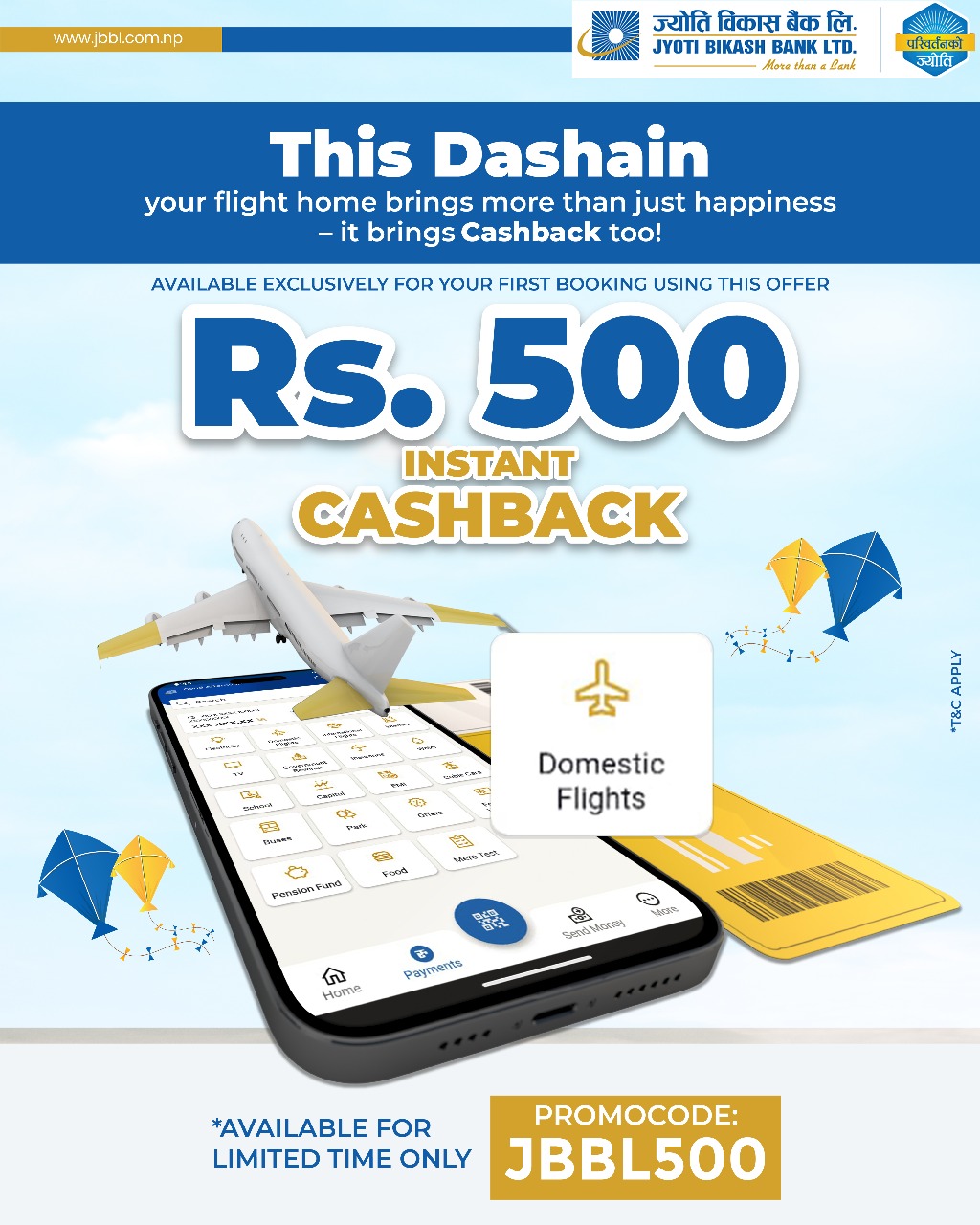 दशैंको अवसरमा हवाई टिकट खरिदमा ज्योति विकास बैंकको रु. ५ सय क्यासब्याक अफर